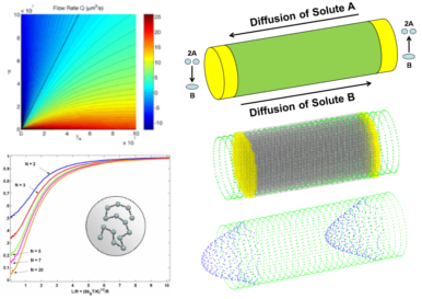 To study systems in regimes applicable to biological systems and microscopic devices we are developing theory to describe microscopic osmotic phenomena both in equilibrium and non-equlibrium settings. Some recent work includes studying how osmotic pressures generated by polymer solutes depend on polymer topology, stiffness, and excluded volume. In related work, a pumping mechanism for a microfluidic device has been proposed which uses reversible chemical reactions to drive fluid flows.