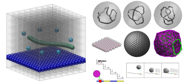 Immersed structures in SIB can be used to represent the mechanics of a variety of microscopic hydrodynamic systems. We have applied the approach to a number of applications, see the figure above and movies below. In the context of complex fluids, immersed structures have been used to represent solute particles, polymers, or membrane structures. We have also extended the SIB approach to study the static and dynamic rheological responses of a number of complex fluids, see the papers below. We are also developing dynamic coarse-grained models of lipid bilayer membranes using the SIB formalism to account for molecular level interactions, lipid-lipid and lipid-solvent hydrodynamic coupling, and thermal fluctuations, see the papers and talks below.