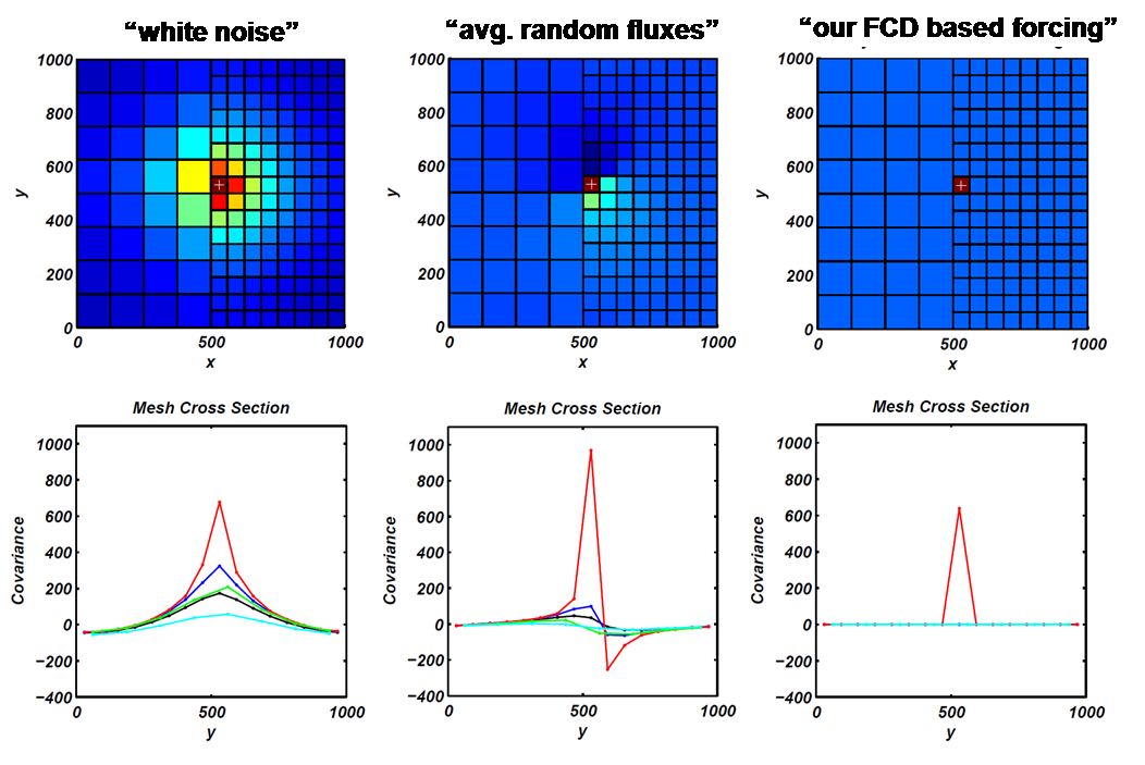 An important feature of the stochastic numerical methods is how the the stochastic driving field is treated at the coarse-refined interface. For a purely diffusive system the equilibrium fluctuations in concentration are essentially spatially uncorrelated at any instant. At coarse-refined interfaces the discretization of the stochastic driving field may introduce artificial long-range spatial correlations. Below is shown the resulting equilibrium covariance structure of fluctuations with the mesh site marked +. Results are shown for the cases corresponding to a white-noise discretized stochastic driving field, a discretized stochastic driving field derived from random fluxes, and our discretized stochastic driving field. To derive consistent discretizations of the stochastic driving field at coarse-refined interfaces, we use notions related to the fluctuation-dissipation principle of statistical mechanics. We are using these approaches to develop a variety of stochastic numerical methods for the study of spatially extended stochastic systems.