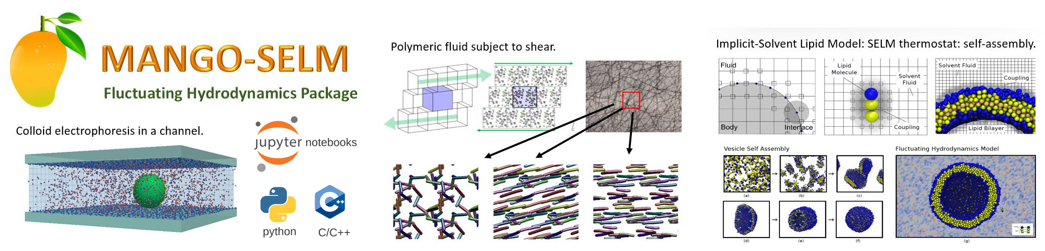 • SELM: Fluctuating Hydrodynamics. Fluid-structure interaction simulations for soft materials and complex fluids using fluctuating hydrodynamics approaches (interfaces with LAMMPS MD package) [github] [tutorials/documentation].