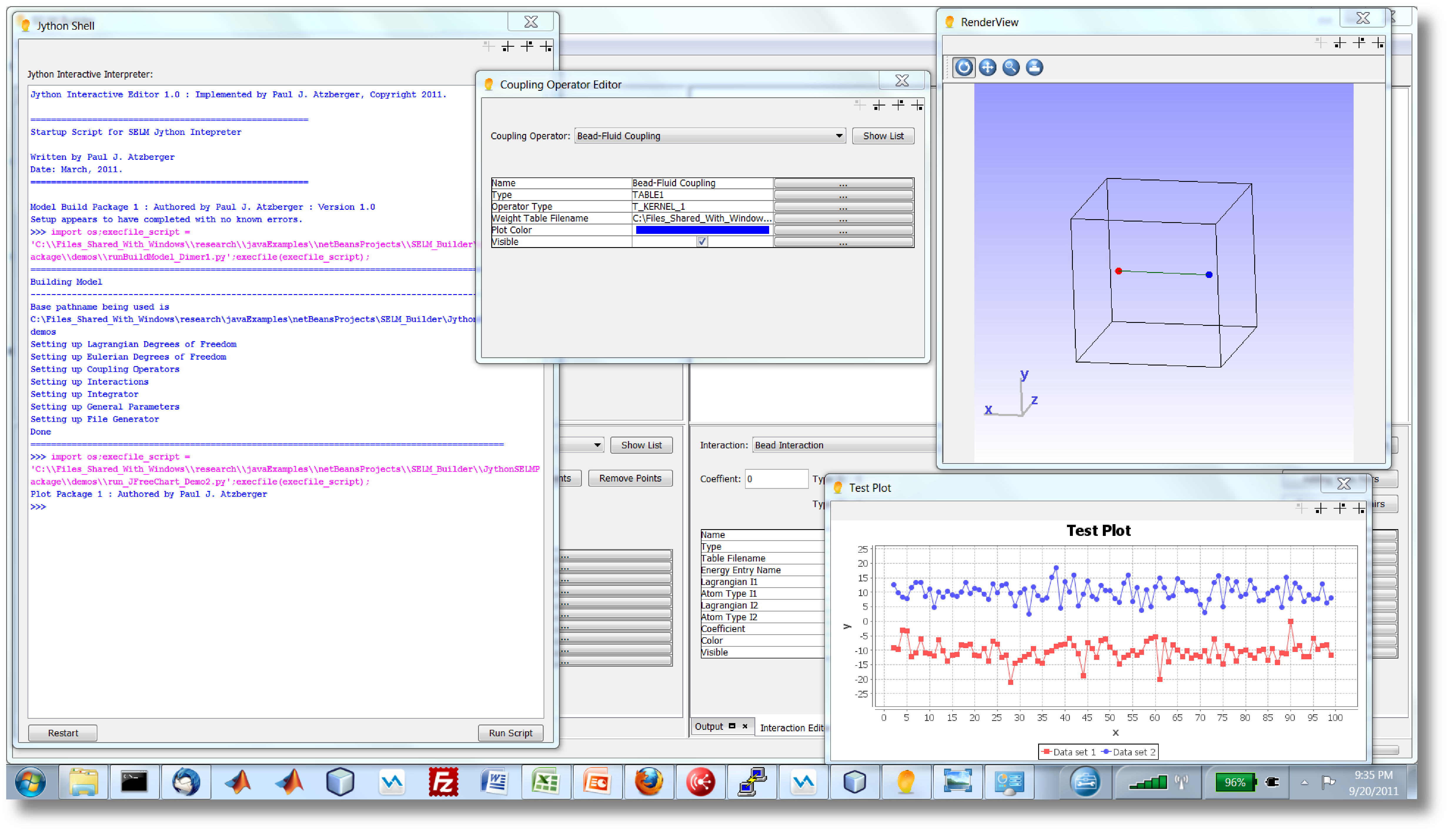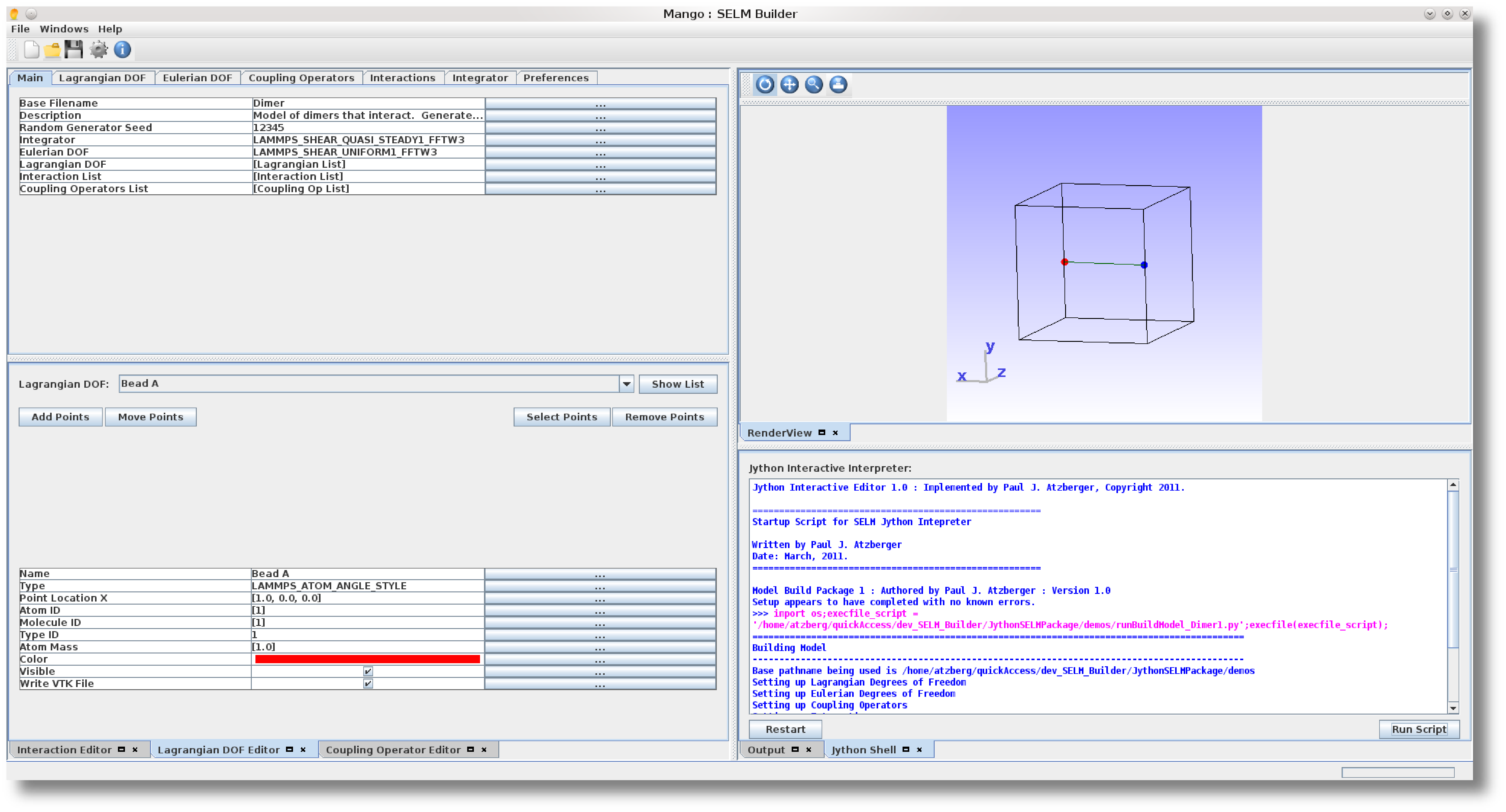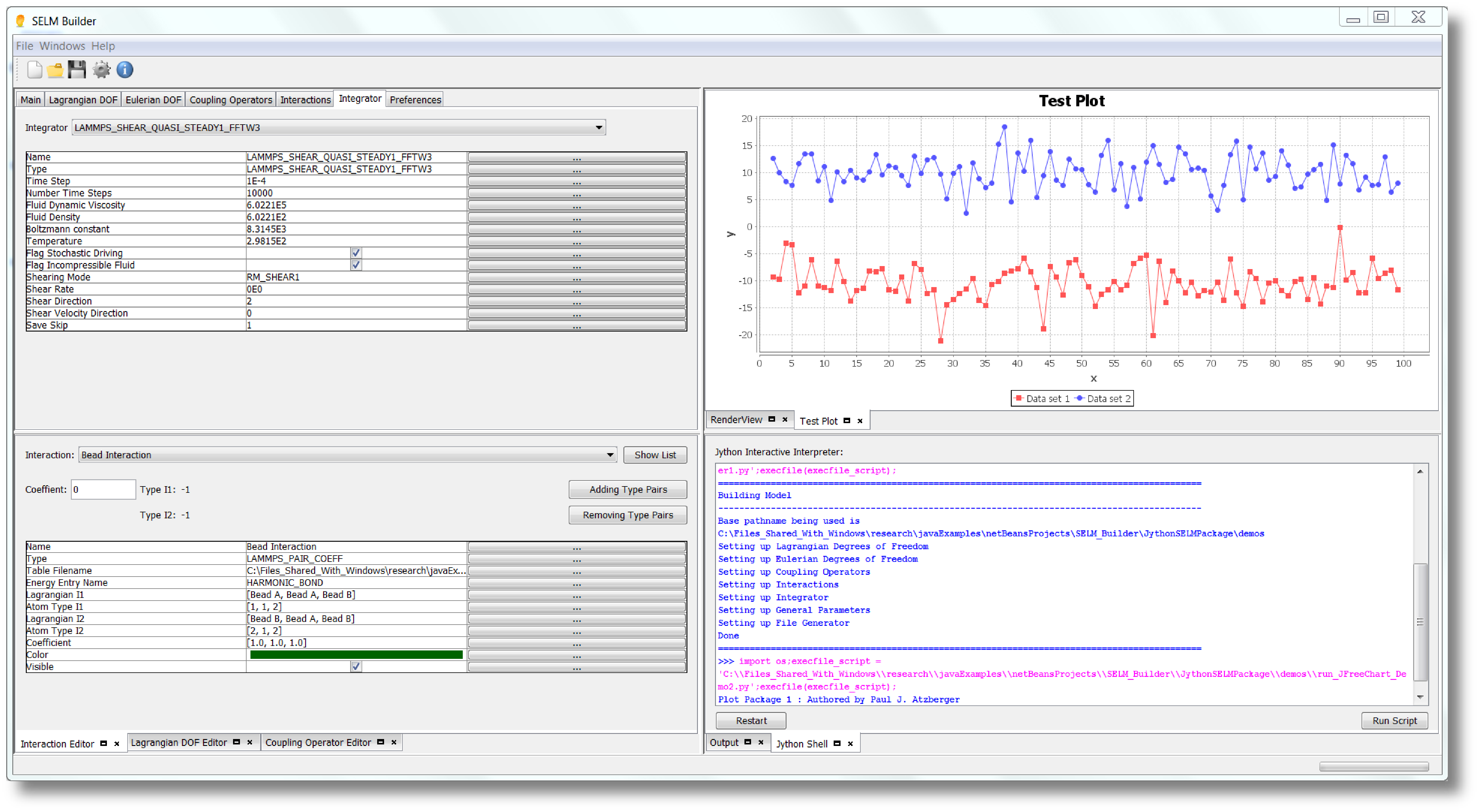 - (Lower Right) An interactive interpreter for Jython (Java+Python) allowing for script commands to be executed to build models or specify parameters. Modifications are visualized in the interface as the script commands are executed.