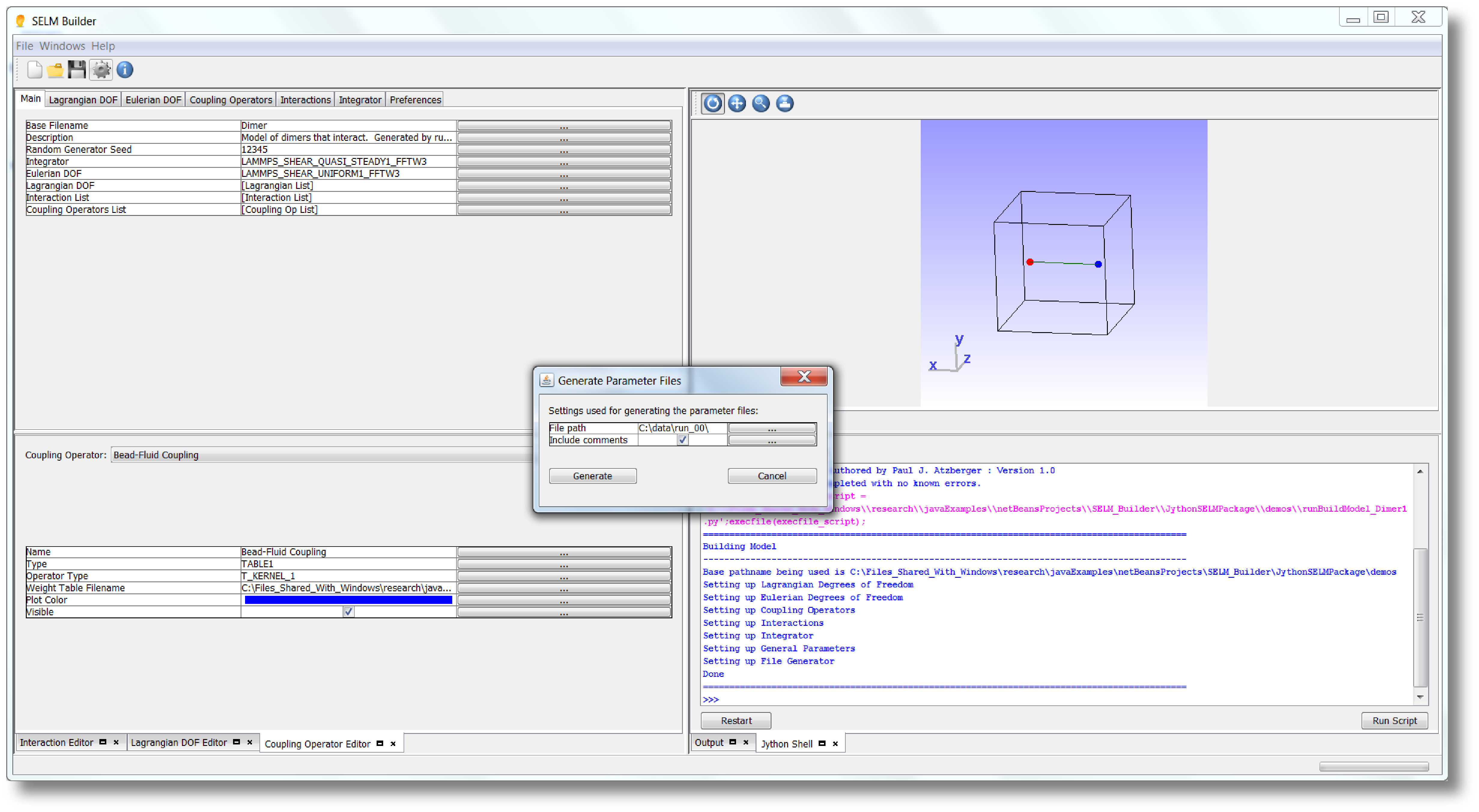 The Mango interface generates a complete set of parameter files for the LAMMPS MD-package and USER-SELM package. This includes a LAMMPS script that allows for easy command line execution of the specified simulation and XML data files that represent the SELM-based model, force interactions, and other parameters for SELM-related sub-routines.